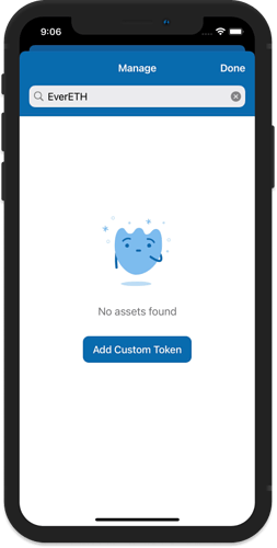 Tap on the toggle sign in the upper right corner of the main Wallet screen. Search for the token, and if the token is not available, you will see a “**No Asset Found**” message with an **Add Custom Token** button.