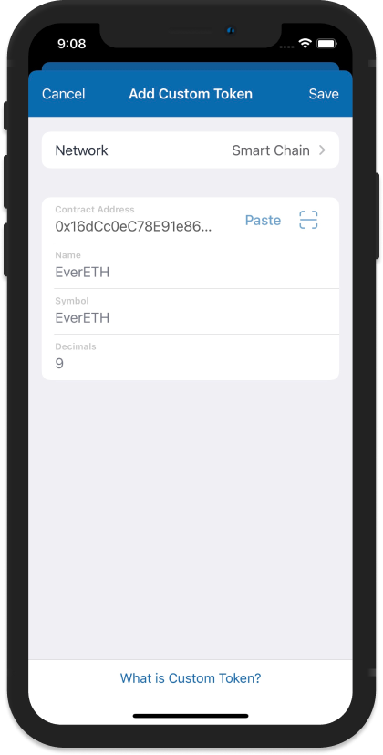 After pasting or scanning the Contract Address, the other details like the **Name**, **Symbol,** and **Decimals** will be automatically filled up. If not, fill them in manually. Tap on **Save** to continue.
